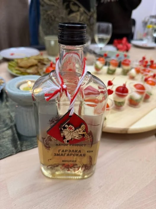 А потом и вовсе запостил в фейсбуке неожиданный снимок: на столе — бутылка водки «Змагарская» с бело-красно-белой тесемкой, к которой прикреплен исторический герб «Пагоня». С пояснением: «Вчера я встречался с людьми, которые <…> в 20-м году помогали мне и всем нам работать в штабе, в «полях» и на митингах».
